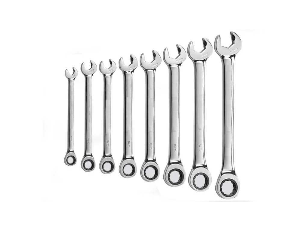 - Sada očkoplochých ráčnových klíčů o velikosti 8, 10, 12, 13, 14, 15, 17 a 19 mm