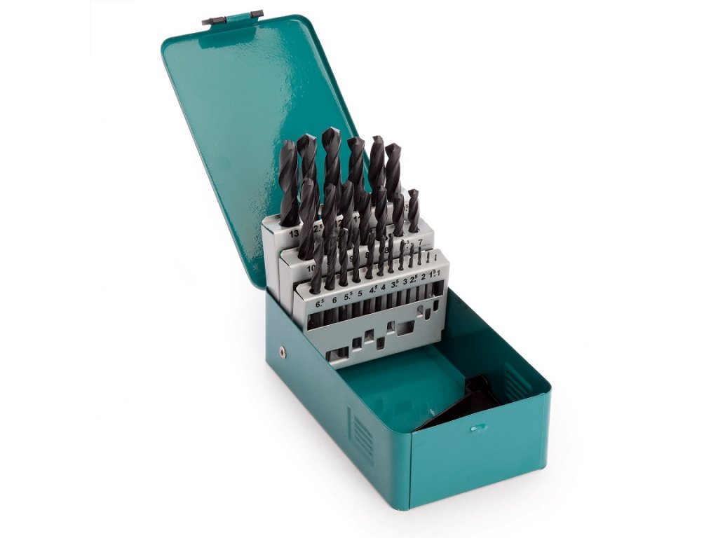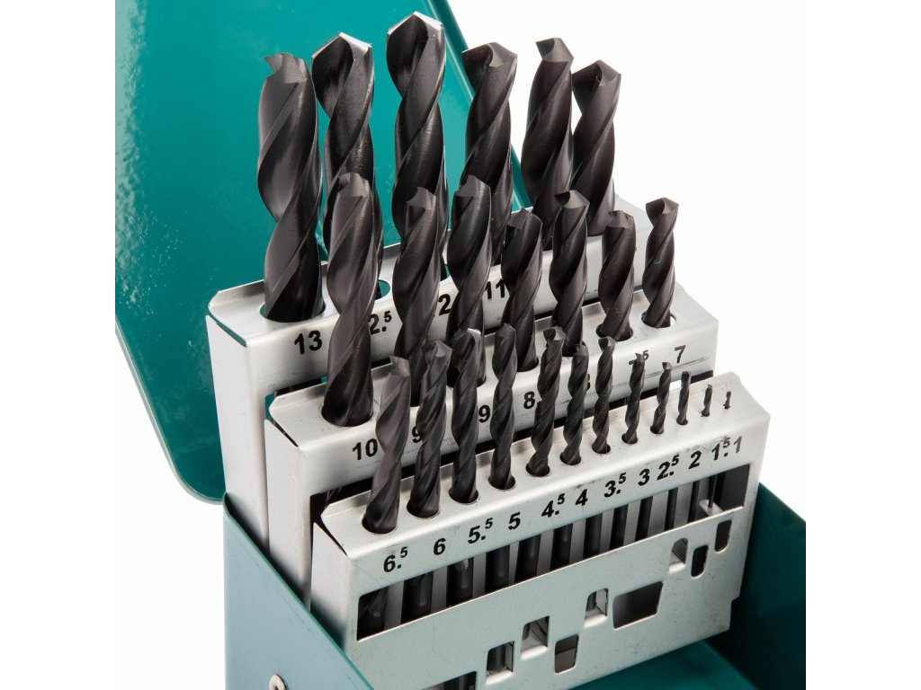 - Sada obsahuje vrtáky o průměru 1; 1,5; 2; 2,5; 3; 3,5; 4; 4,5; 5; 5,5; 6; 6,5; 7; 7,5; 8; 8,5; 9; 9,5; 10; 10,5; 11; 11,5; 12; 12,5; 13 mm