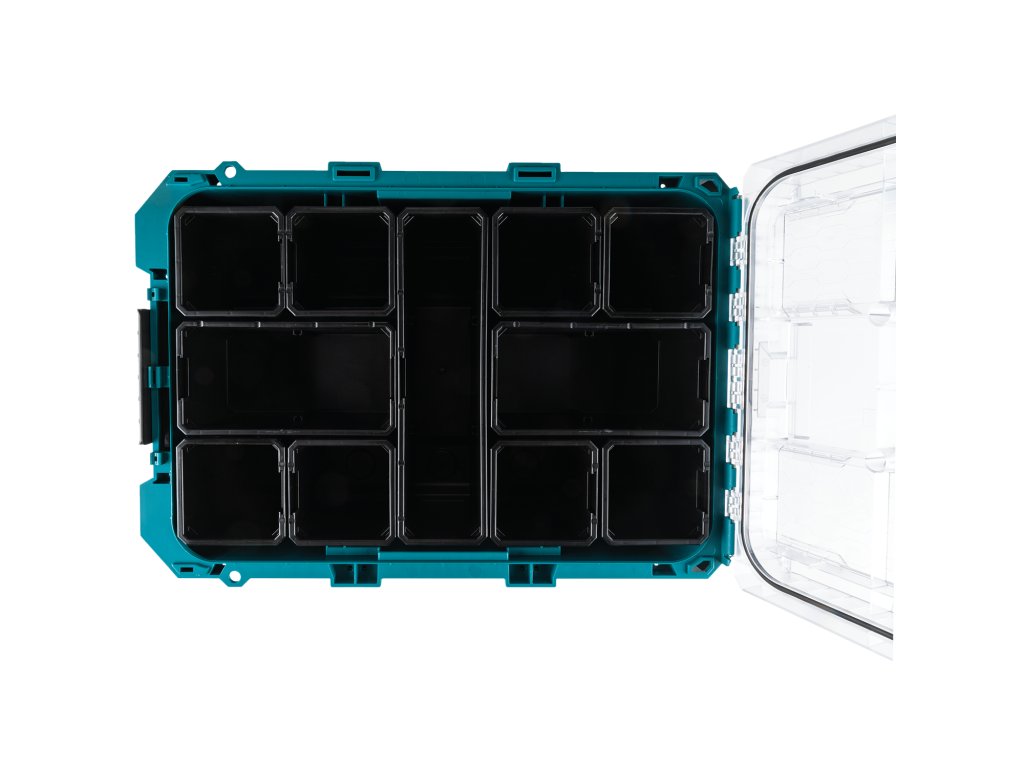 Průhledné víko pro snadný pohled dovnitř a žebrovaný design zajišťuje přihrádky proti pohybu 11 vyjímatelných přihrádek organizéru pro všestranné skladování